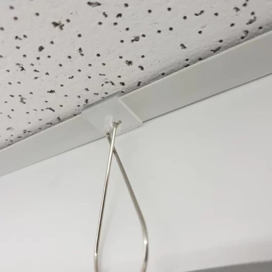The hole/eyelet within the piece that hangs down makes these T-rail clips (also known as ceiling clips) perfect for attaching wire hangers to graphics and posters. This feature offers flexibility and ease of use when it comes to displaying your materials.